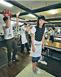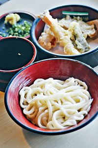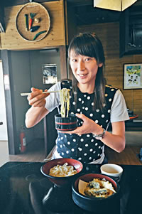 課堂分為兩節,先是學習如何切出及格的烏冬麵條,老師一早已準備了小麥粉糰,我們跟?茷?示,逐步完成把粉糰搓揉、摺疊等步驟,對煮慣烏冬的林慧美來說自然駕輕就熟,不諳入廚的我則有點手忙腳亂,當完成最後的切麵功序,把烏冬掛在筷子上互相比較,頓時高下立見,我的粗幼長度參差得像斷掉的橡筋,實在有失美感!第一節課程不大順利,不過第二節學習搓粉,卻成了我的拿手好戲,學校為讓課堂輕鬆有趣又易記,竟想出烏冬歌舞的橋段,部分學員負責搖鼓吶喊打氣,主力搓粉的就要脫掉鞋子,腳踩膠袋內的半完成粉糰,只見大眾就如在跳健康舞的玩得忘形,最終搓出的粉糰也當然特別均勻!課堂過後,就是品嘗自家成品的時候,雖說我的作品賣相欠佳,但放湯煮好,再配上天婦羅等美食,味道還算不俗!