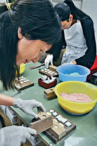 香川縣得天獨厚,精良優質的出產眾多,當中包括有「讚岐三白」之稱的地道名物——棉花、食鹽和砂糖,而論到當地的優良糖產,不得不提的便是以甘蔗提煉的和三盆糖。這種專門在香川縣和德島縣出品的糖,據說是以人手搓揉,再經天然風乾而成,由於提煉時每天研磨三次,因而得出和三盆之名,當地人視之為日本優質食糖,用來製作高級和?X子,而琴平的手信店ズウわビ,便提供和三盆?X子的製作體驗。製作過程其實相當簡單,只需把糖粉倒進特製的木模,然後用力壓緊及掃去多餘材料,倒出作品便即大功告成,只是說來容易,要做出完整的作品卻要聚精會神。說到和三盆?X子的味道,大眾或各有所好,我雖覺得有點過甜,但用抹茶伴吃卻是相當配搭,而最吸引我的還是?X子